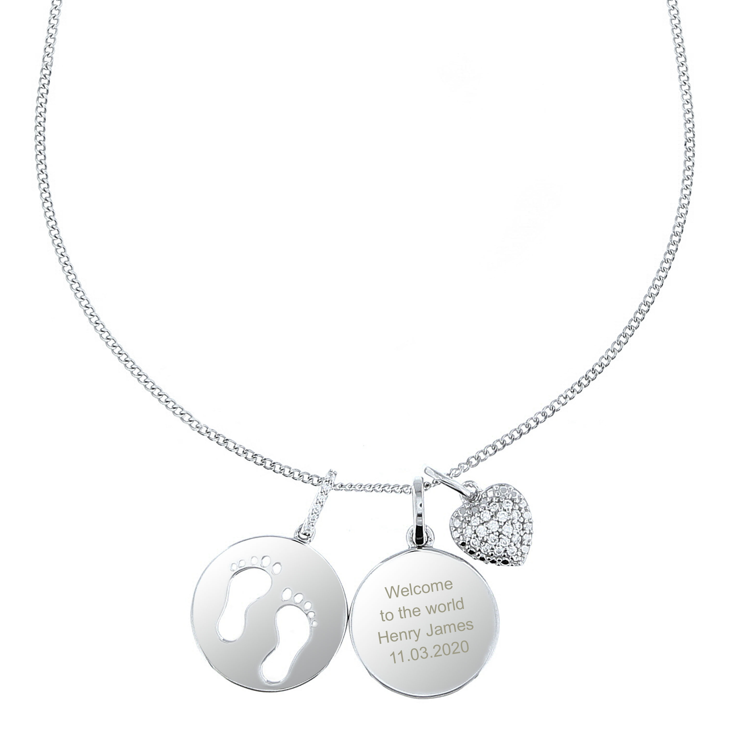 Personalised Sterling Silver Footprints and Cubic Zirconia Heart Necklace