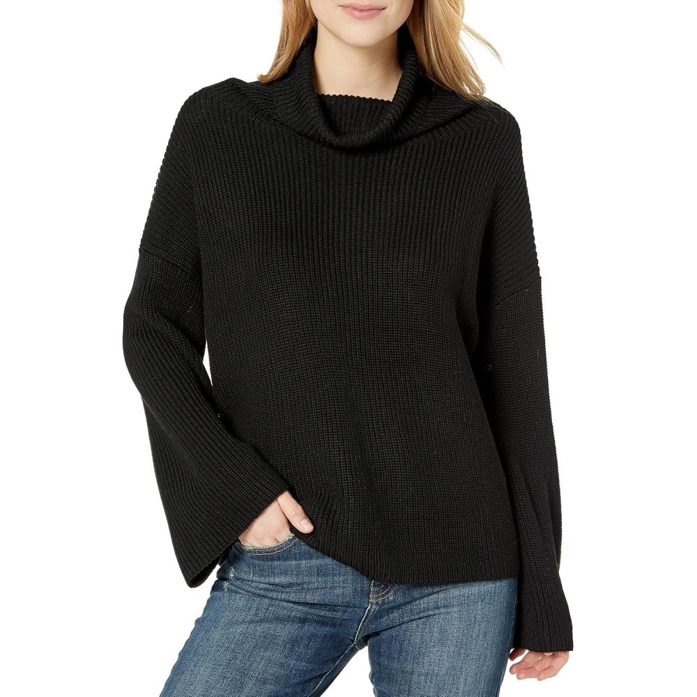 Cable Stitch Women’s Funnel Neck Oversized Sweater – Wide Cuff Long Sleeve Loose Fit Solid Color Pullover Top(Black)