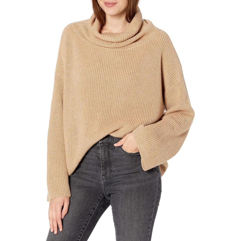 Cable Stitch Women’s Funnel Neck Oversized Sweater – Wide Cuff Long Sleeve Loose Fit Solid Color Pullover Top(Camel)
