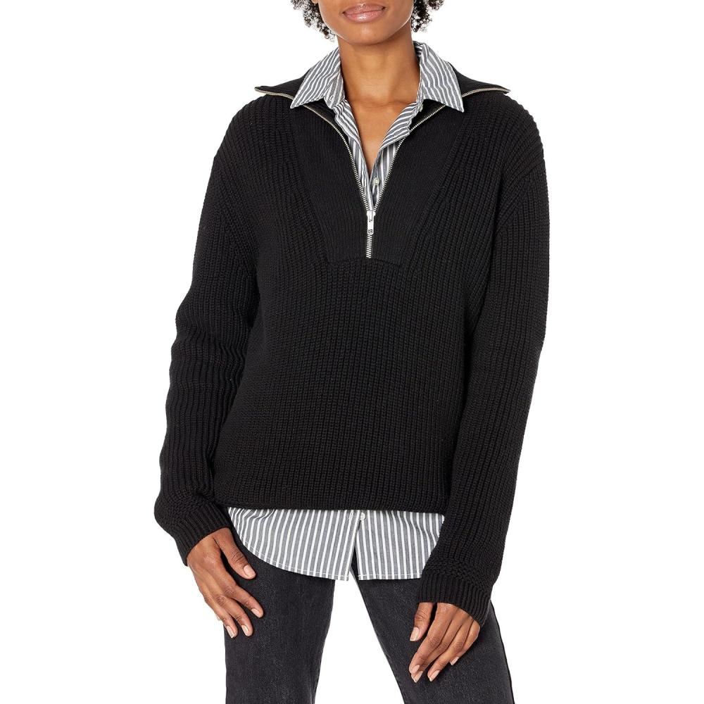 Cable Stitch Women’s Half Zip Cotton Pullover Sweater – Solid V-Neck Collar Loose Rib-Knit Long Sleeve Top(Black)