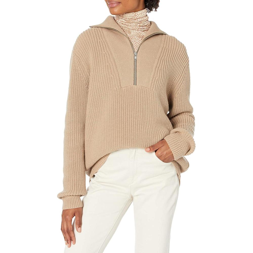 Cable Stitch Women’s Half Zip Cotton Pullover Sweater – Solid V-Neck Collar Loose Rib-Knit Long Sleeve Top(Camel)