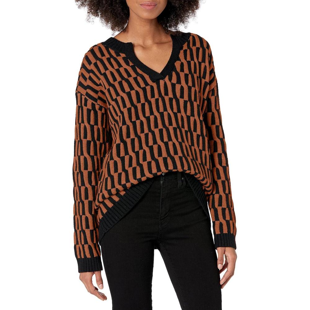 Cable Stitch Women’s Intarsia Sweater – Star, Lightning Bolt, Heart Graphics Long Sleeve Crewneck Pullover Top(Black/Caramel)