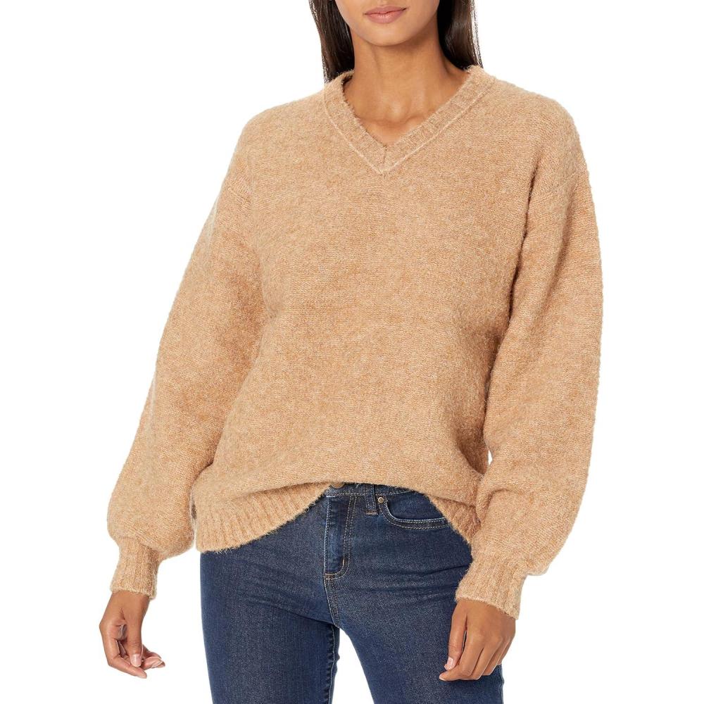 Cable Stitch Women’s Cozy Boucle V-Neck Sweater – Long Balloon Sleeve Oversized Solid Color Pullover Knit Top(Camel)