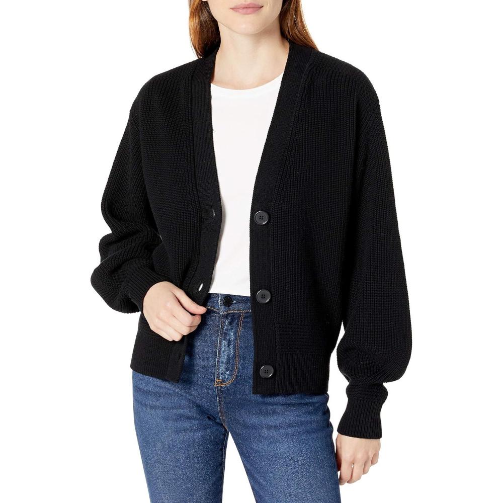 Cable Stitch Women’s Cropped Textured Cardigan – Button Front V-Neck Shaker Fisherman Stitch Balloon Sleeve Oversized Sweater(Black)