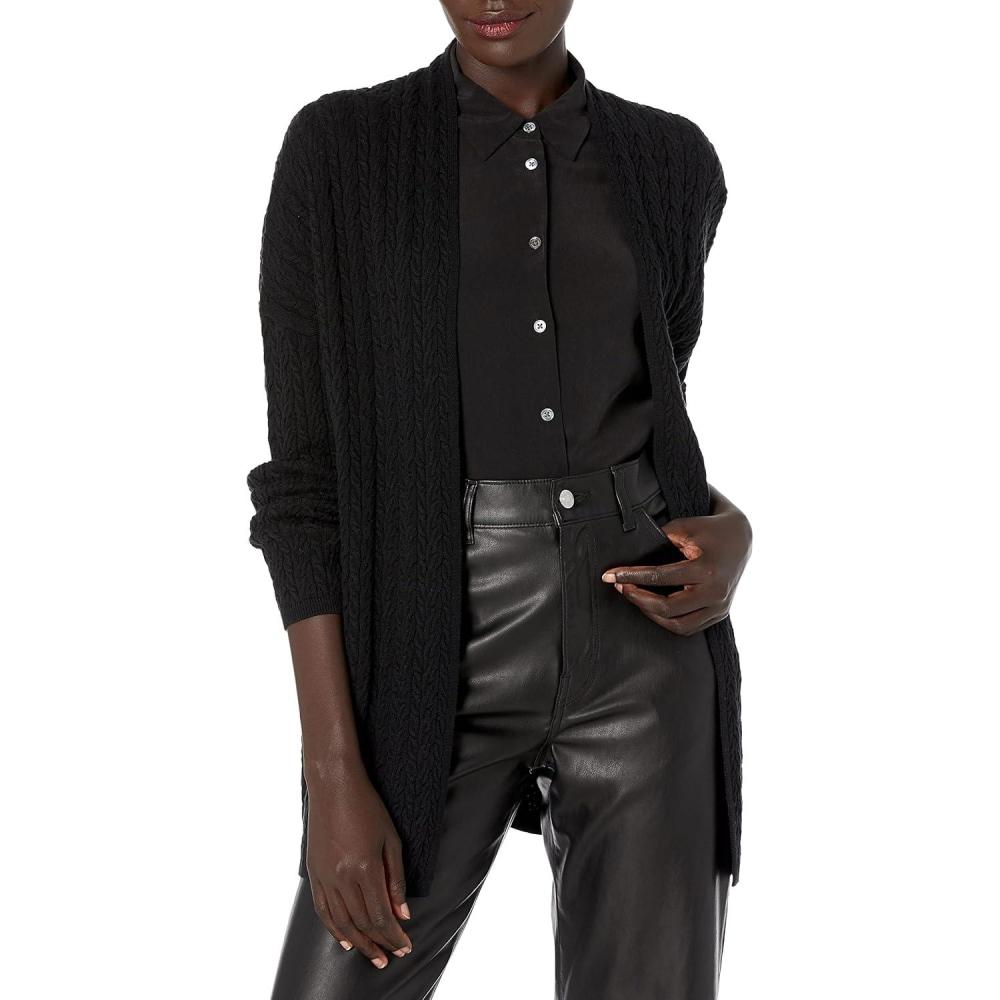 Cable Stitch Women’s Open Front Cable Cardigan – Long Sleeve Lightweight Sweater Knit Cover-Up(Black)