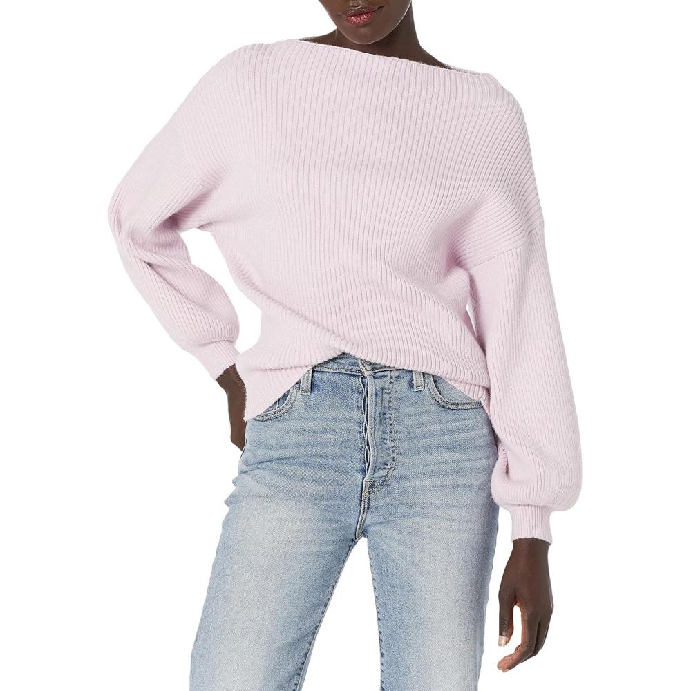 Cable Stitch Women’s Ribbed Blouson Sleeve Sweater – Boat Neck Long Sleeve Drop Shoulder Solid Color Pullover Knit Top(Lilac Pink)