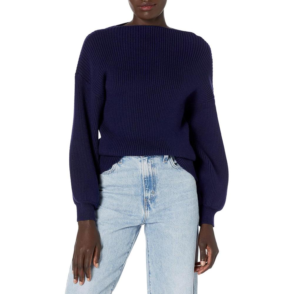 Cable Stitch Women’s Ribbed Blouson Sleeve Sweater – Boat Neck Long Sleeve Drop Shoulder Solid Color Pullover Knit Top(Navy)