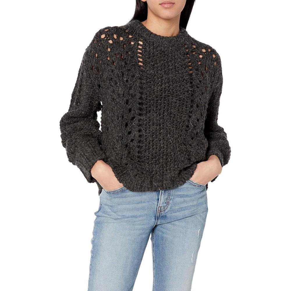 Cable Stitch Women’s Chunky Wool Blend Pointelle Sweater – Crewneck Extra Long Sleeve Open Stitch Cropped Pullover Knit Top(Charcoal)