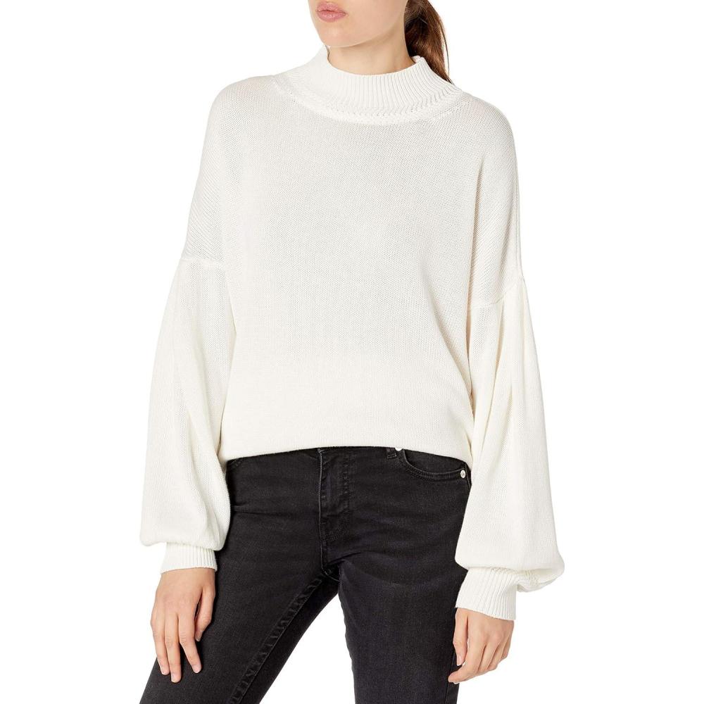 Cable Stitch Women’s Pleated-Sleeve Sweater – Mock Neck Puff Blouson Long Sleeve Drop Shoulder Solid Color Pullover Top(Birch White)