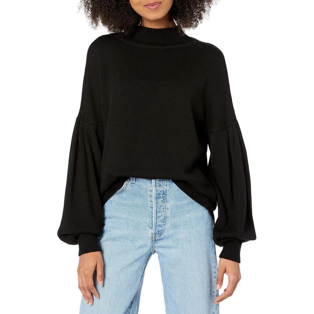 Cable Stitch Women’s Pleated-Sleeve Sweater – Mock Neck Puff Blouson Long Sleeve Drop Shoulder Solid Color Pullover Top(Black)