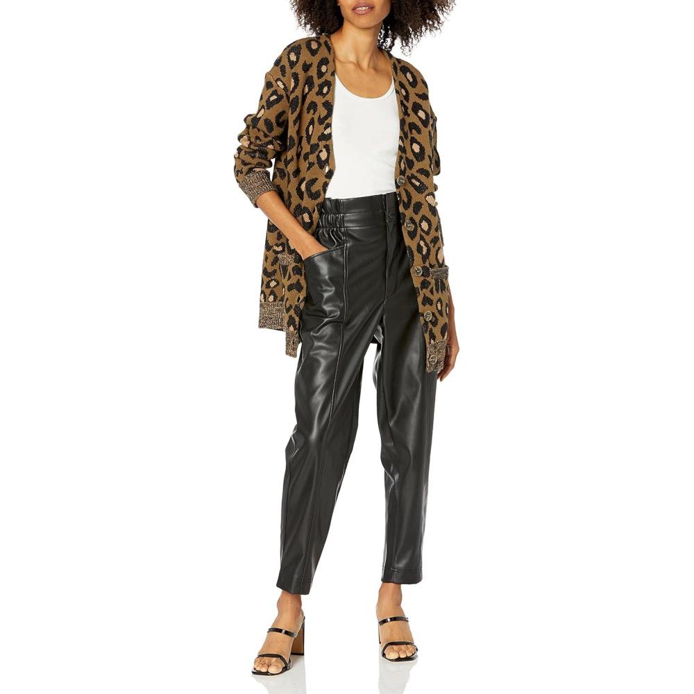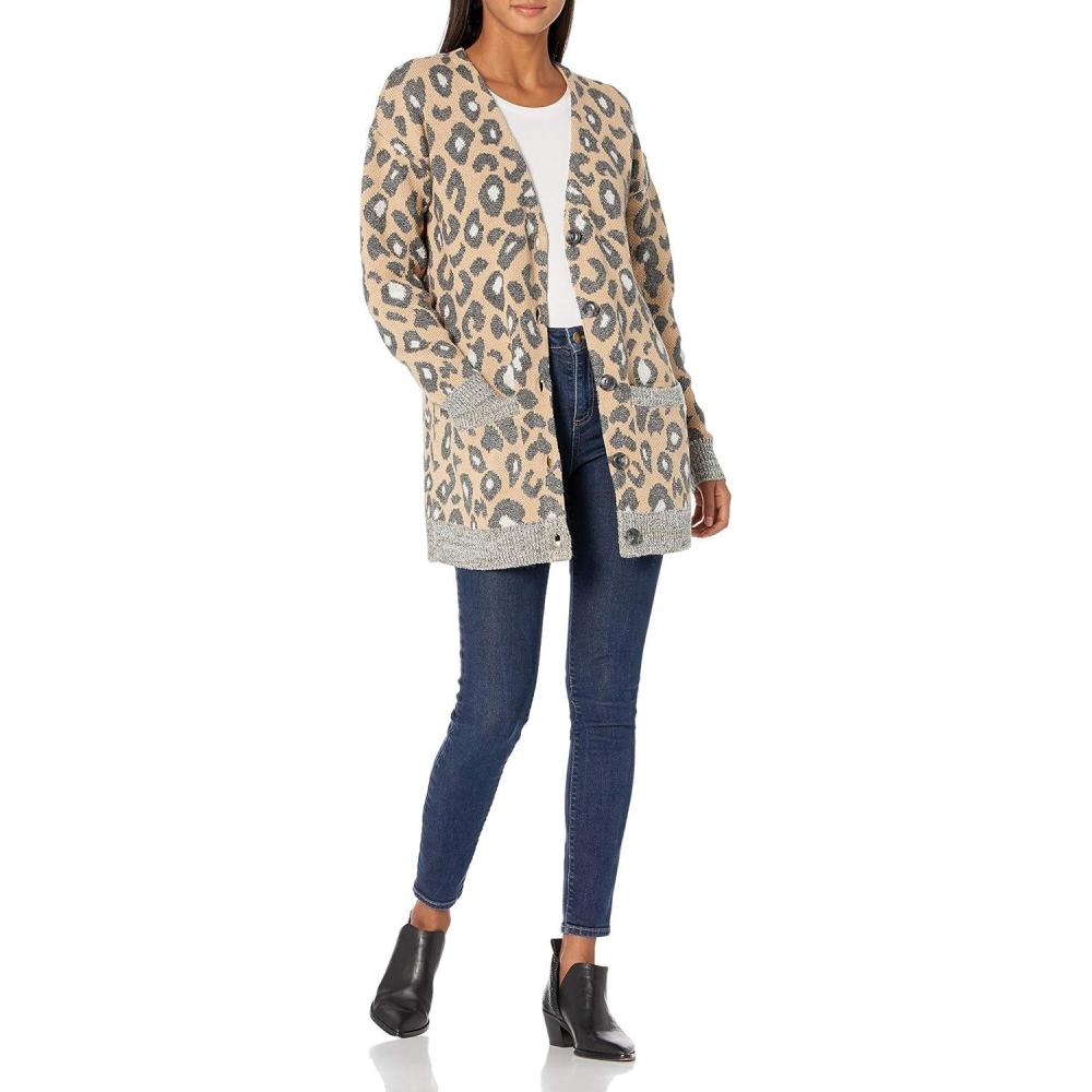 Cable Stitch Women’s Oversized Button Front Leopard Plaid Print Sweater Cardigan with Pockets - V-Neck Jacquard Coatigan(Multi Taupe)
