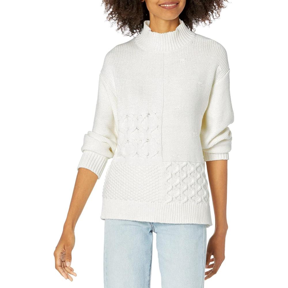 Cable Stitch Women’s Oversized Mixed Cable Sweater – Mock Turtleneck Long Sleeve Drop Shoulder Patch Knit Pullover Top(Cream)