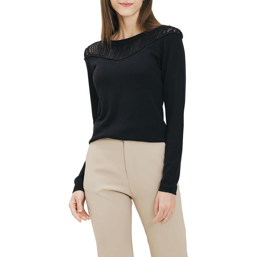 Cable Stitch Women’s Pointelle Inset Sweater – Long Sleeve Crewneck Lace Crochet Knit Pullover Top(Black)