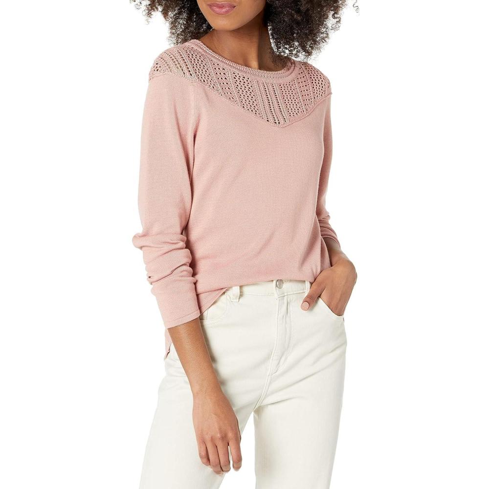 Cable Stitch Women’s Pointelle Inset Sweater – Long Sleeve Crewneck Lace Crochet Knit Pullover Top(Dusty Pink)