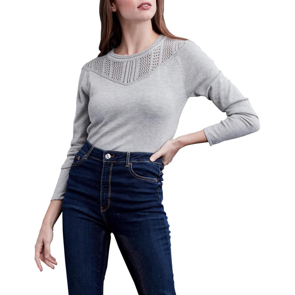 Cable Stitch Women’s Pointelle Inset Sweater – Long Sleeve Crewneck Lace Crochet Knit Pullover Top(Heather Grey)