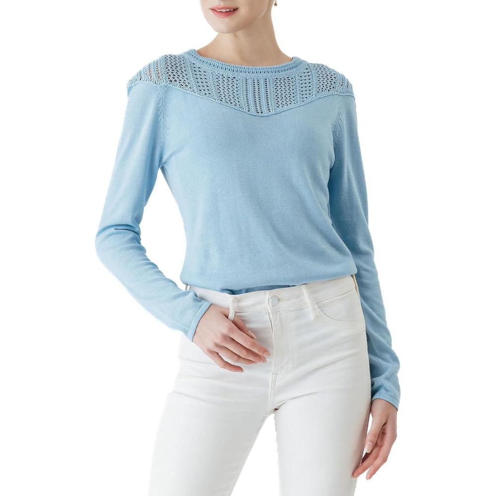 Cable Stitch Women’s Pointelle Inset Sweater – Long Sleeve Crewneck Lace Crochet Knit Pullover Top(Light Blue)