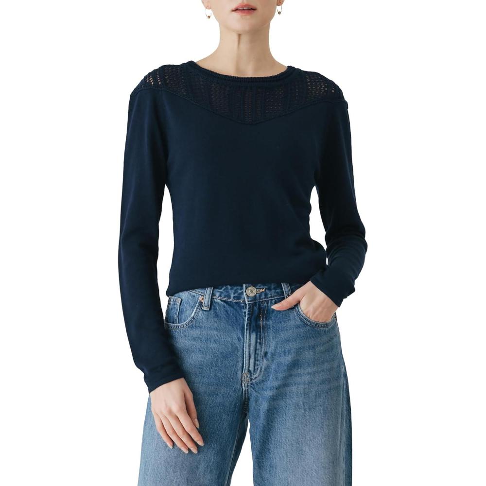 Cable Stitch Women’s Pointelle Inset Sweater – Long Sleeve Crewneck Lace Crochet Knit Pullover Top(Navy)
