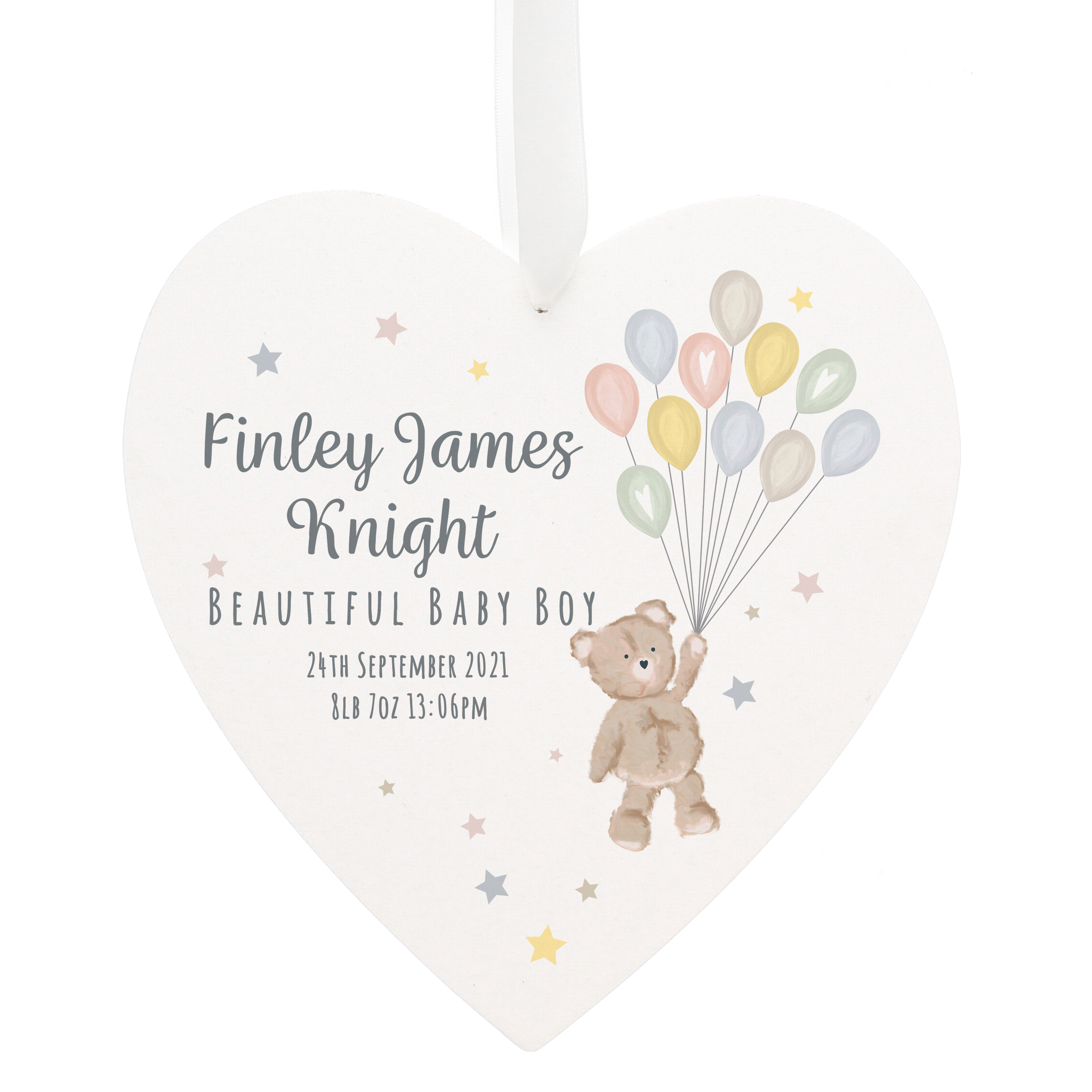Personalised Teddy & Balloons White Wooden Heart