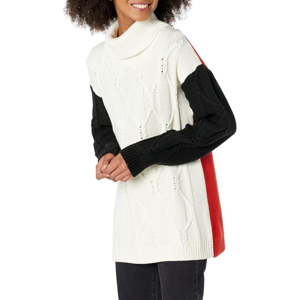 Cable Stitch Women’s Cable Turtleneck Sweater – Oversized Colorblock Contrast Long Sleeve Chunky Pullover Knit Top(Cream/Black/Poppy)