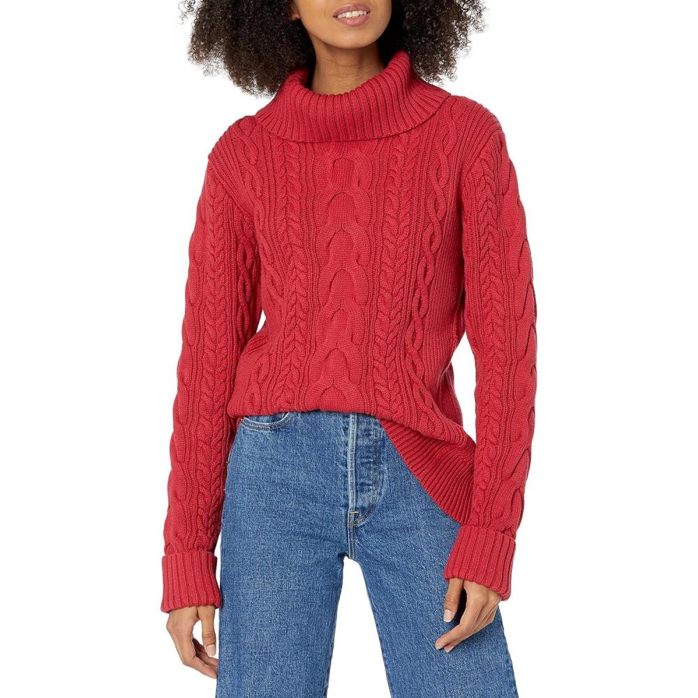 Cable Stitch Women’s Cotton Blend Cable Knit Turtleneck Pullover Sweater – Fisherman Long Sleeve Chunky Textured Top(Red)
