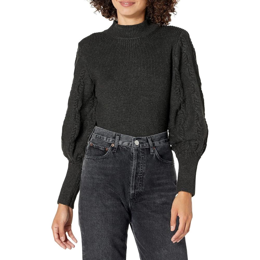 Cable Stitch Women’s Cable Sleeve Ribbed Sweater – Mock Neck Long Blouson Lantern Sleeve Pullover Top(Charcoal)