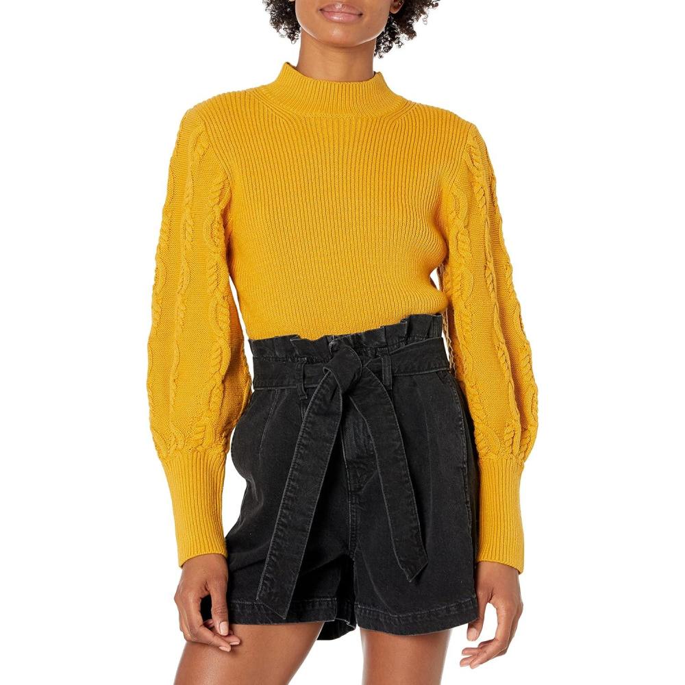 Cable Stitch Women’s Cable Sleeve Ribbed Sweater – Mock Neck Long Blouson Lantern Sleeve Pullover Top(Marigold)