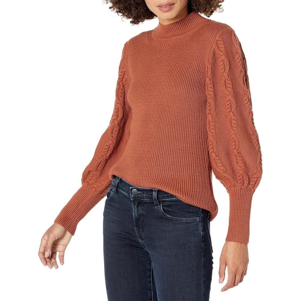 Cable Stitch Women’s Cable Sleeve Ribbed Sweater – Mock Neck Long Blouson Lantern Sleeve Pullover Top(Nutmeg)