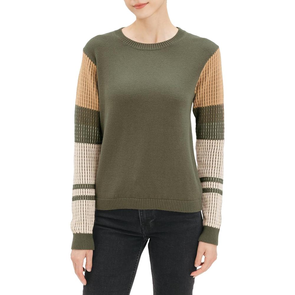 Cable Stitch Women’s Contrast-Sleeve Cotton Sweater – Crewneck Long Sleeve Knitted Pullover Top(Olive)