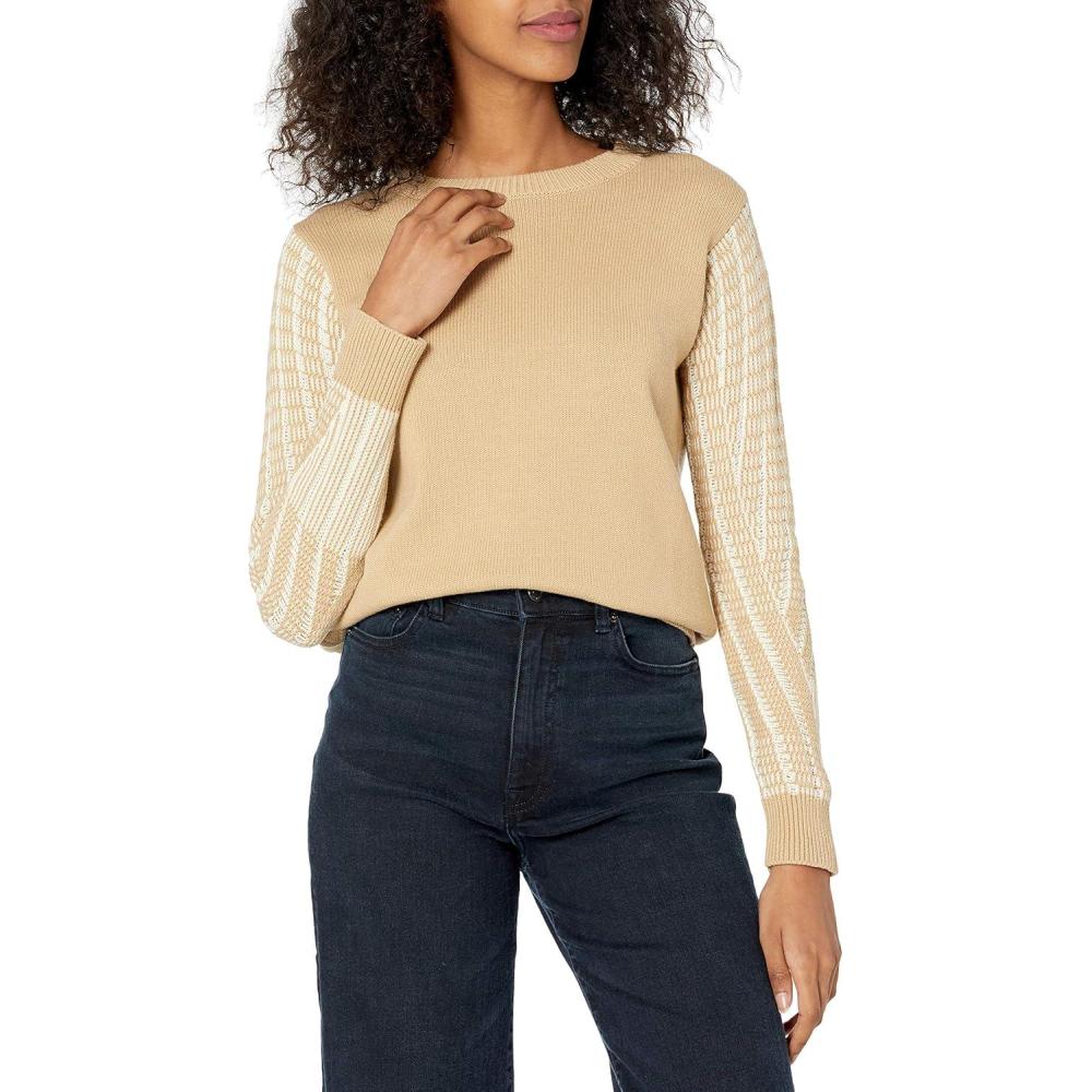 Cable Stitch Women’s Contrast-Sleeve Cotton Sweater – Crewneck Long Sleeve Knitted Pullover Top(Wave Camel)